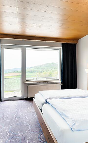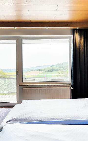 Unsere Eifel Panorama Zimmer sind circa 25qm groß und ausgestattet mit braunem Holz.