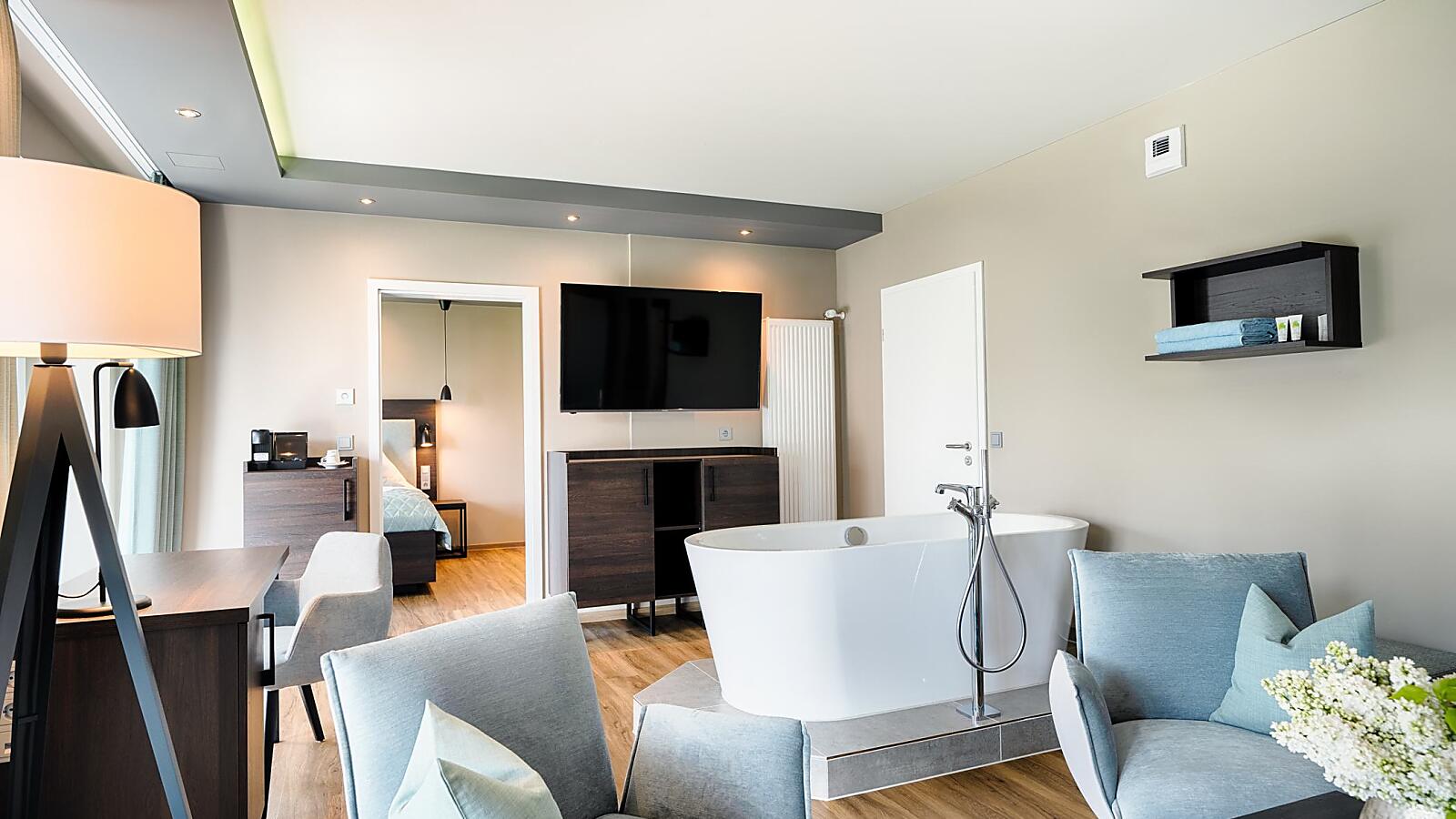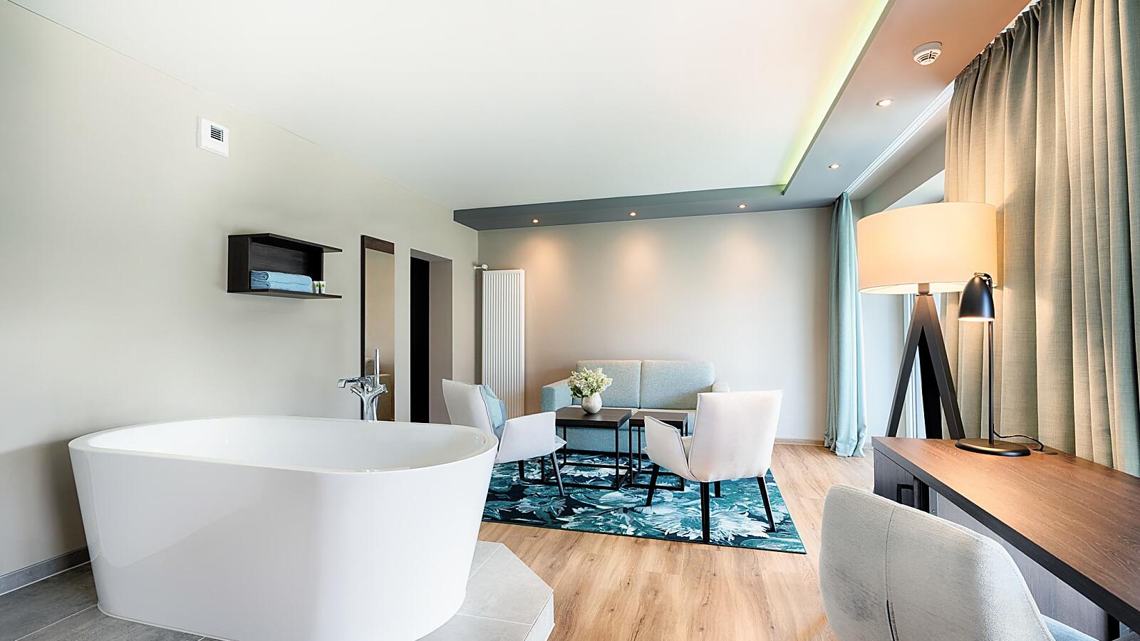 Unsere Eifel Premium Suite ist circa 48qm groß. Erleben Sie die Großzügigkeit in unserer Wellness Suite. Ausgestattet mit feinen Materialien und getrenntem Wohn- und Schlafbereich können Sie so richtig relaxen. Die Minibar ist bei Anreise für Sie gefüllt. Neben der großzügigen Dusche im Badezimmer erwartet Sie eine offene Badewanne im Wohnbereich.