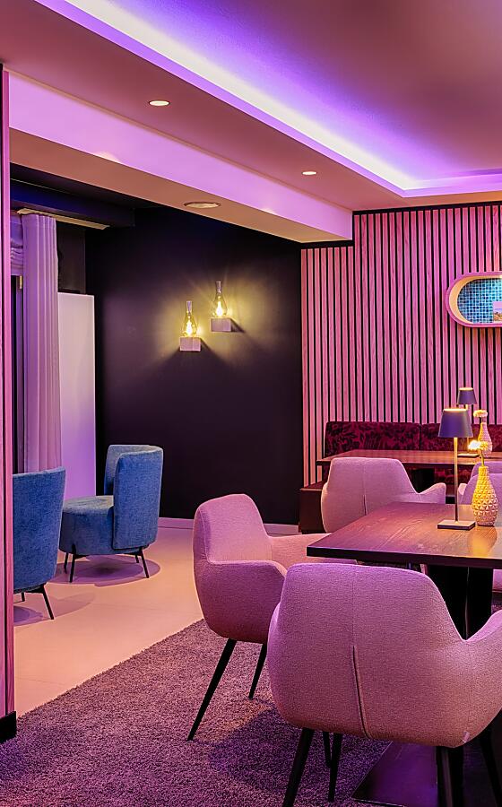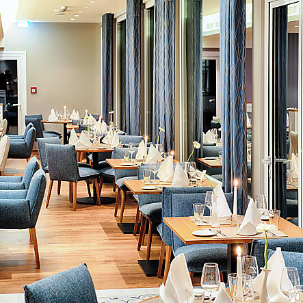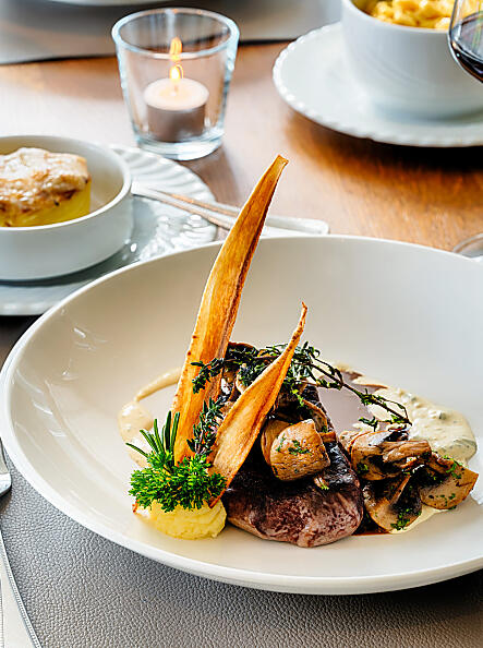 Subtle shades of blue, gray, and green, candlelight, and lovingly arranged plates: In our restaurant in Gerolstein, we welcome you with a relaxed and cozy atmosphere. To complement our dishes, we are happy to serve fine selections from our wine cellar, followed by a regional digestif, such as our Eifelgeist or Eifeler Williams pear brandy from Gerolstein. Feeling hungry yet? Then reserve your table now or look forward to a tasteful end to your vacation day!